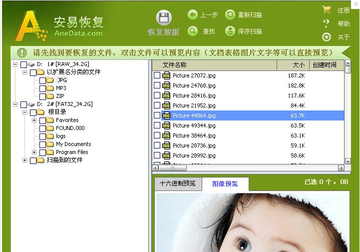 4. 按文件头扫描恢复功能:当文件记录被破坏的时候,是无法按原先的文件名来恢复的,安易硬盘数据恢复软件内置了多种按扩展名进行扫描的算法,支持Office文件 (DOC/ DOCX/ XLS/ XLSX/ PPT/ PPTX)、数码相片文件(JPG/ NEF/CR2 /X3F/ SR2/ PNG)、视频文件(3GP/ MP4/ RMVB/ MOV/ MPG/ MOD/ FLV)、压缩包文件(ZIP/ RAR)等多种文件格式。