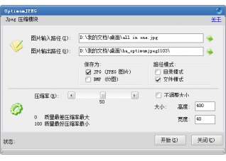 Optimum JPEG是款jpg图片批量压缩软件,支持一次性将jpg图片转换成具有统一压缩率和大小的图片,压缩率决定了图片大小和质量,以通过拖动压缩条设置图片的压缩比例。图片大小可以任意修改,没有固定比例限制。
