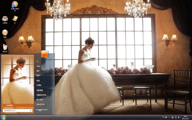 你有没有想象过自己的婚礼。结婚时候的场景呢?这款结婚进行时美女win7主题,是由主题之家(www.xitong138.com)为您推荐的。看图中的美女穿着洁白的婚纱,在房间等待着新郎。淡淡的微笑在她的嘴边。看着很甜蜜。真是一位幸福的新娘。