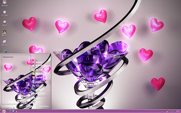 爱的心形图案渐渐地沉浮在空气中,映红了半个画面,粉色爱心朵朵,色彩斑斓,充满了无限的情趣,让人眷恋,让人感慨无限。绚丽的爱,色彩是美丽的,诱人的,给你一次绚烂的回忆。主题上杯子里盛放着紫色的记忆,一杯子,一辈子。金属物品围绕着这个杯子,仿佛萦绕在情侣之间不变的诺言,而空气中的爱心则是由这个杯子所产生的爱的气泡,如此唯美而又有深意的主题,你还在等什么呢?