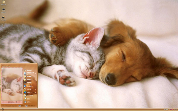 动物界里与人类最亲近的两种小动物,要属小猫与小狗了。这两只可爱的萌宠在一起的时候通常会打打闹闹,呲牙咧嘴,很少能和睦相处。当然也不是所有的猫狗都是这样哦。主题中这两只小动物就相处的非常好,猫与狗同在一张床上睡觉呢!它们这可是相亲相爱,形影不离,是非常要好的朋友。看的让人禁不住想抱着它们一同就寝。狗狗就像大哥哥,在保护着小猫妹妹,它们睡得是那么的熟,谁还会忍心打扰它们呢?喜欢这两只小可爱的就赶紧下载吧。