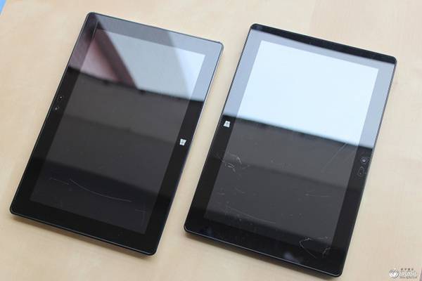 正面屏幕上方,二者各有一颗2MP的前置摄像头。下方则是一颗触控的window8 LOGO。即使在息屛的状态下,也能响应触控操作,唤醒屏幕。这颗触控键需要用户把手指正对按下,较大面积的接触才能达到效果,侧向或者位置稍偏都不行。