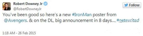 这张海报是小罗伯特·唐尼在推特首发,推文上还附有一句话:“8 天后有重大事件宣布。”