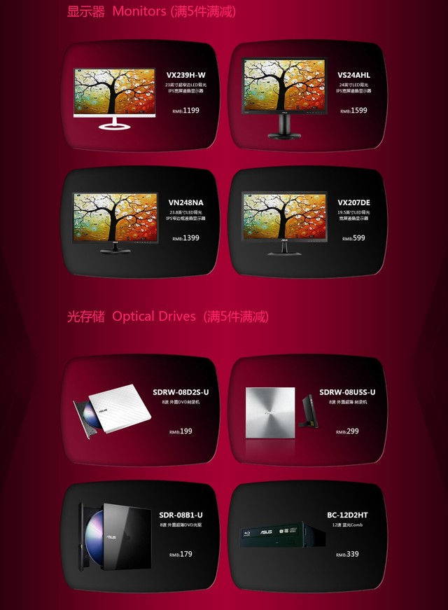 有些师兄该有疑问了,我学妹再多也不能买五块主板回学校熬着吃啊。华硕考虑到这种情况,除了显卡外还特别邀请了显示器和光存储来参与了本次活动,主板+显示器+显卡+光存储凑足四件,再加上电脑必不可少的CPU,享受购买5件就立减的优惠就是妥妥的了。