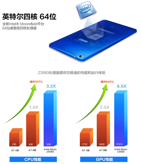 华硕ME581C平板运行Android 4.4.2系统,搭载了22nm工艺的Intel Moorefield Z3560四核魔法芯处理器。在CPU性能方面AndEBench测试数据显示,Intel Moorefield Z3560高于多价位产品CPU约3.2倍;GPU方面在3D Mark测试数据下显示高于多价位产品GPU约6.5倍,可以让用户拥有更加流畅的体验,内存2GB及高速固态存储硬盘16GB的组合兼顾了流畅性和性价比的选择。除此之外,华硕ME581C最高可以持续播放视频9小时,续航能力非常出色,可以享受一整天不间断的娱乐体验。