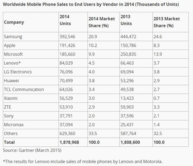 2014年,凭借更大的屏幕尺寸,苹果iPhone在中国的销量增长了56%,在美国的销量增长了88%。Gartner分析师安舒尔·古朴塔(Anshul Gupta)称:“三星市场份额于2013年第三季度创下历史新高,目前仍在努力控制不断下滑的市场份额。这种下滑趋势表明,三星在高利润率的高端智能手机市场的份额面临巨大压力。”