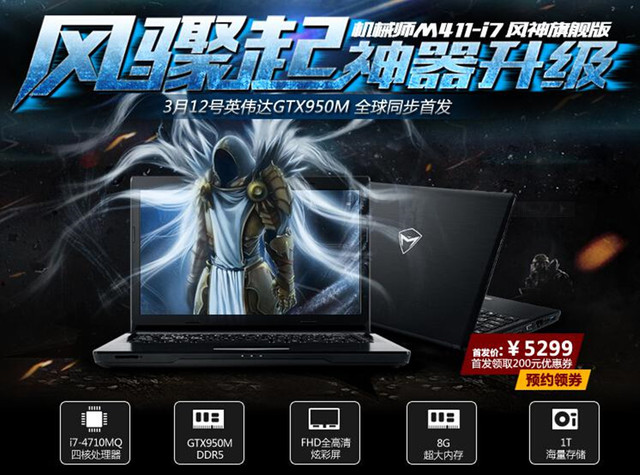看完参数,有何时上市疑问的小伙伴听仔细了。据了解,3月12日,机械师M411将在天猫首发,期间将实行5299元的首发价,另外3月3日-3月11日,收藏宝贝即赠送200元首发优惠券,5000元左右就能将这款好本抱回家,感兴趣的亲们可以到天猫免费申请页面一睹详情。http://machenikeky.tmall.com/tryshop.htm?id=18960033&v=1