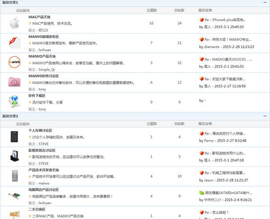 MAC产品天地、MAIWO新闻发布区、MAIWO产品天地、MAIWO软件讨论区、软件下载区、个人存储讨论区、影视发烧友讨论区、产品技术开发者天地、电脑周边产品讨论区、二手交换区。