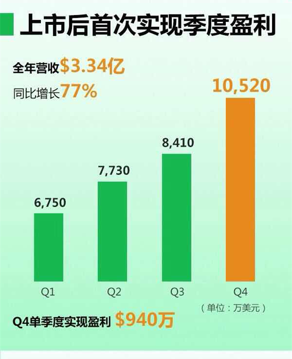 净营收3.342亿美元,较上年度增长77%。广告和营销营收2.648亿美元,较上年度增长78%。微博增值服务(微博VAS)营收6940万美元,较上年度增长74%。归属于微博普通股股东的净亏损为6340万美元,较上年度增长66%,合每普通股摊薄净亏损34美分。2014年、2013年的净亏损中依次包含与阿里巴巴投资微博相关的投资者期权负债公允值调整带来的4700万美元亏损、2110万美元收益。