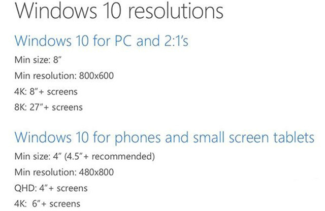 据微软所演示的幻灯片,Windows 10原生支持4K和8K分辨率。其中4K分辨率要求PC或2合1设备达到8寸或更大尺寸,8K分辨率则要求至少27英寸屏幕;而小尺寸设备如平板电脑和智能手机,4K分辨率则要求6英寸或更大尺寸,至于8K分辨率则该设备并不支持。
