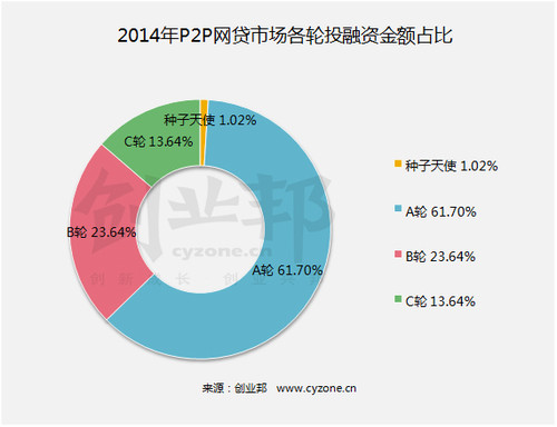 2014年,P2P网贷市场公布的投融资事件共52起,由于部分企业并未透露详细情况,《创业邦》根据其发布的量级统计,P2P网贷市场投融资所涉及的金额在45.46亿元左右。其中:天使轮10起,金额0.46亿元;A轮34起,金额28.05亿元;B轮6起,金额10.75亿元;C轮2起,金额6.20亿元。