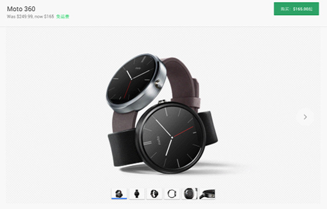 谷歌商店官网显示,Moto 360还有黑色和岩石色可供选择,包装内附带有一个充电基座和壁式充电器,而Moto 360无线充电基座的售价为39.99美元(约合人民币248元)。除了降价之外,谷歌还表示,当前购买Moto 360还免运费。