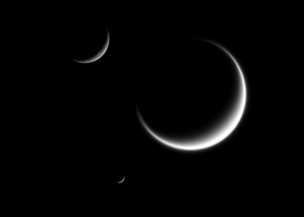 一弯新月挂在漆黑夜空就已经是一个令人为之惊叹的景象。在地球,人们能看到的新月最多也只有一个,所以一次性看到三弯新月怕是人们想都不敢的吧。不过就在日前,NASA的“卡西尼”飞船捕捉到了这样一番奇特的景象--三弯新月同时出现在一个画面里面。据悉,土星总共有50多颗已知卫星。