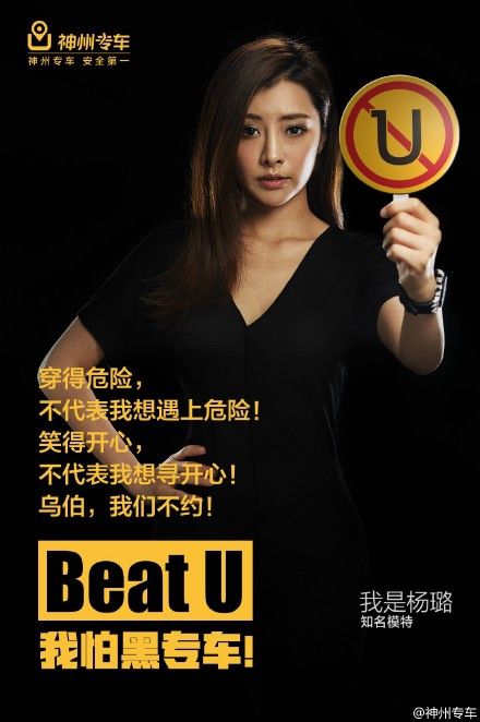 今天,神州专车在微博平台上公布了一组以“Beat U,我怕黑专车”为主题广告,将矛头直指Uber。广告中请到了著名演员吴秀波、海清站台。