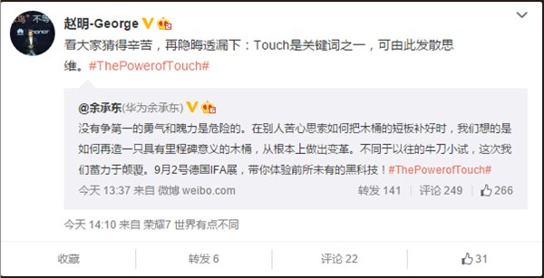 在上述内容结尾,余承东还加上了“ThePowerofTouch”的话题,同时荣耀总裁赵明也在互动中,再次对Touch关键词进行了强调,似乎对于@evleaks大神华为Mate8支持ForceTouch的爆料进行了确认。