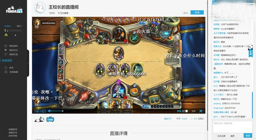 从界面以及UI来看,熊猫TV与目前其他几家直播平台大同小异,并没有比较特殊的地方,甚至一眼觉得这和斗鱼的界面都非常类似。下图为王思聪直播打炉石中,校长的房间ID为10000。