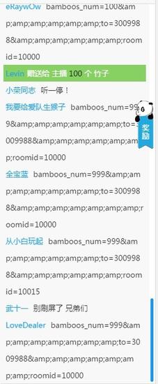另外,王思聪表示目前平台还有大量BUG,所以现在发放的激活码比较少,在未来BUG逐步解决后,会向那些申请激活码的邮箱大量发放,直至正式上线。下图为玩家发现的一个BUG,似乎是只要在弹幕中输入这串代码,便可以获得一定数量的竹子,不过该BUG应该已经被修复。