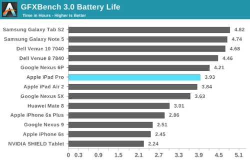 Basemark OS II续航测试能充分压榨CPU性能,而从测试结果可以估算出iPad Pro除了屏幕外的功耗大约是5W,也就是说A9X无论性能还是功耗都足以和Intel Core M相媲美!