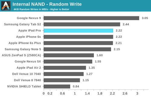 NAND闪存性能:基本和iPhone 6S差不多,相当的凶猛,毕竟用上了NVMe。Surface Pro 4里边的PM951也很彪悍,但后者有更多的闪存芯片并行,而且最大容量达到了512GB。如果iPad Pro也有这么大容量的直接对比一下Surface Pro 4,肯定会非常有趣。