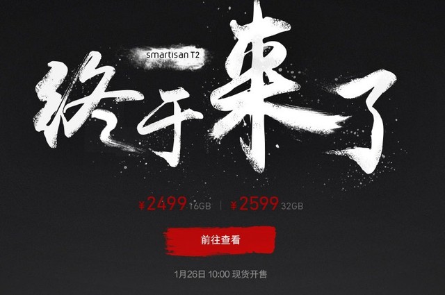 具体来说,明天上午10点,Smartisan T2将登陆天猫锤子旗舰店,16GB版售价为2499元,32GB则是2599元。