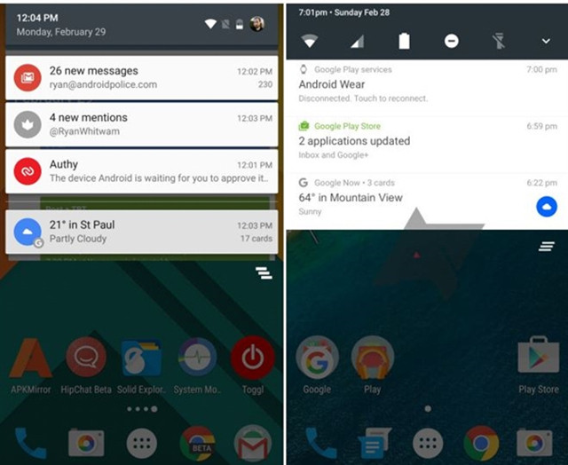 据外媒报道,如果不出意外,谷歌将在今年5月份举行的I/O开发者大会上发布最新的Android N系统(Android7.0)。现在国外开发者首次展示了Android N(Android 7.0)的通知栏(状态栏),相较Android 6.0变化不小。