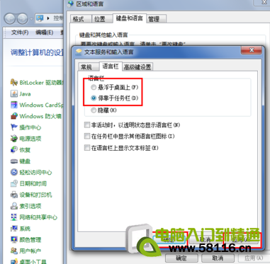 7.将语言栏的状态改为“悬浮于桌面上”或者“停靠于任务栏”,然后点击右下方的“应用”和“确定”按钮,这样就可以看到输入法的图标了