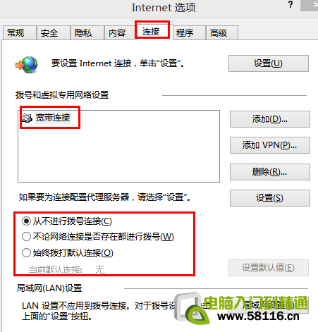 Windows 8.1如何解决弹出自动拨号窗口,Windows 7和Windows 8系统开机出现弹出宽带自动拨号对话框,设置打开internet选项,选择当前宽带连接,点击从不进行拨号连接,确定即可。如下图: