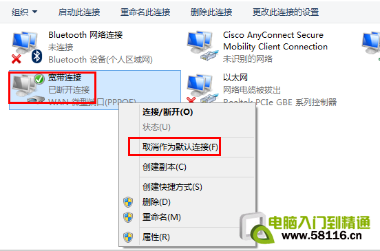 Windows 8.1此功能已经取消,在宽带连接上右击单击“取消此作为默认连接”设置即可。