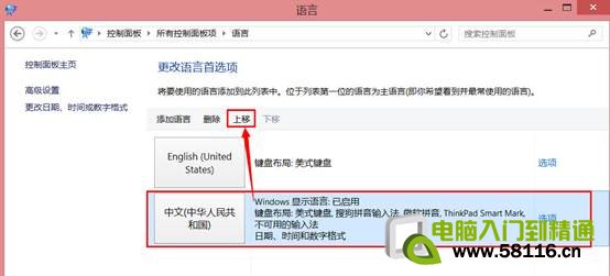 2. 在语言窗口中将“中文(中华人民共和国)”上移到第一位,选择“中文(中华人民共和国)”点击“上移”;