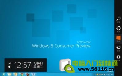 Windows8中引入了Charms边栏,可将鼠标移到右下角即可在右侧弹出,也可以按快捷键Win+C弹出,会显示日期时间以及搜索、共享、设置等菜单,非常方便