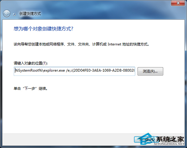 1、在桌面新建“快捷方式”; 在嵌入对象位置输入: %SystemRoot%\explorer.exe /e,::{20D04FE0-3AEA-1069-A2D8-08002B30309D} 点击下一步;