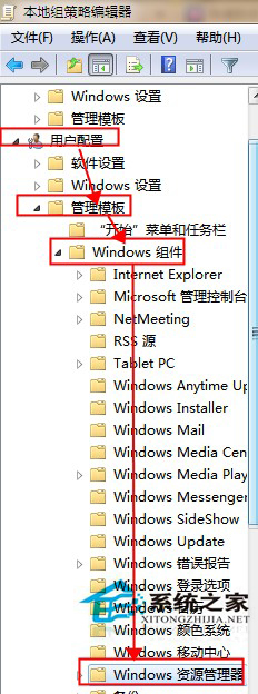 2、在组策略窗口左侧依次展开“用户配置—管理模板—Windows组件—Windows资源管理器”;