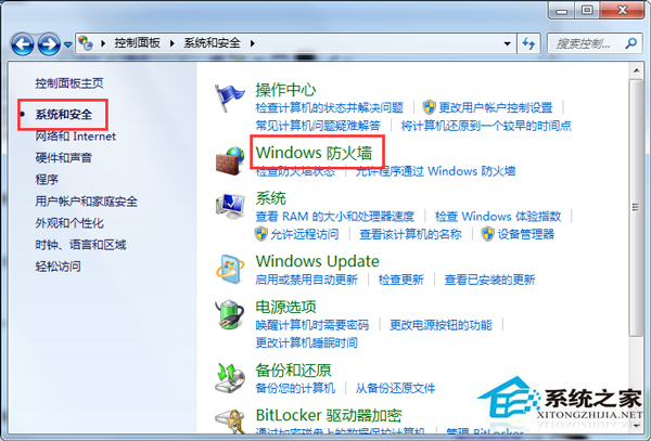 1、在开始菜单下,打开控制面板,选择系统与安全,然后点击“Windows 防火墙”。