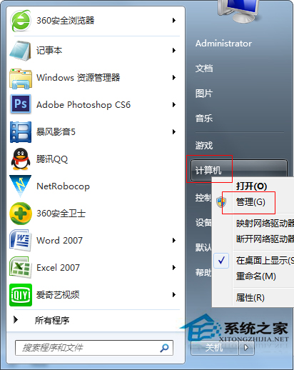1、点击开始菜单,在“计算机”上单击右键,选择“管理”;