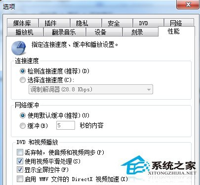 三、接着在选项窗口中,切换到性能项中,取消勾选“启用WMV文件的DirectX视频加速”。