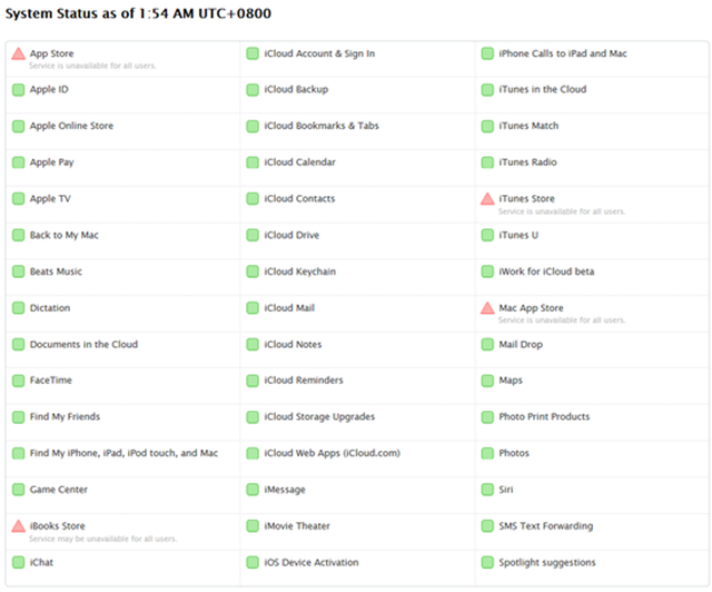 苹果公司周三称,App Store、iTunes Store、Mac App Store和iBooks Store等在线服务全面宕机,原因是遭遇了一个内部DNS(域名系统)错误。苹果公司称:“我们正在努力设法尽可能快地恢复这些服务,并对所有人的耐心表示感谢。”苹果网站称:“用户可能无法从App Store、iTunes Store、Mac App Store和iBooks Store进行购买活动。”