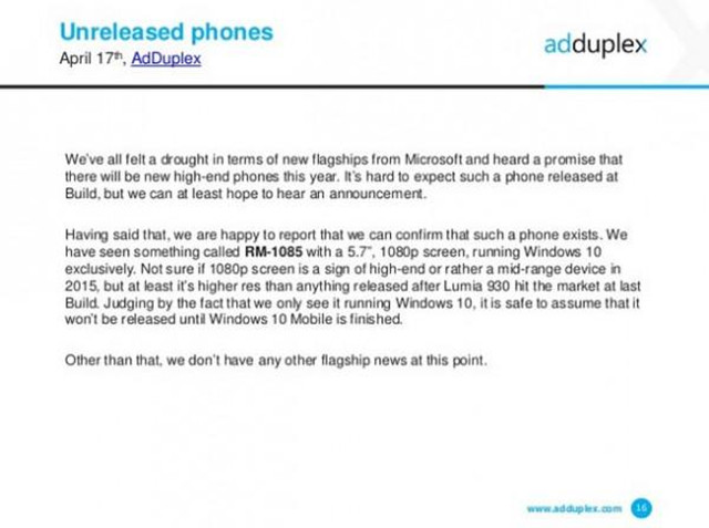 移动广告商AdDuplex信息显示,一款内部代号为RM-1085的微软新机已经出现在Windows 10更新日志中,并配有5.7英寸1080p分辨率屏幕,搭载微软最新的操作系统。不过,由于现在还没有这款RM-1085更多信息被披露,所以有关该机的真实身份也存在诸多猜测。