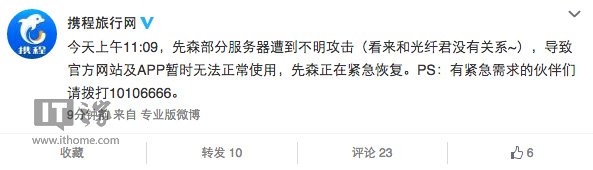 携程网官网微博回应称:今天上午11:09,先森部分服务器遭到不明攻击(看来和光纤君没有关系~),导致官方网站及APP暂时无法正常使用,先森正在紧急恢复。PS:有紧急需求的伙伴们请拨打10106666。